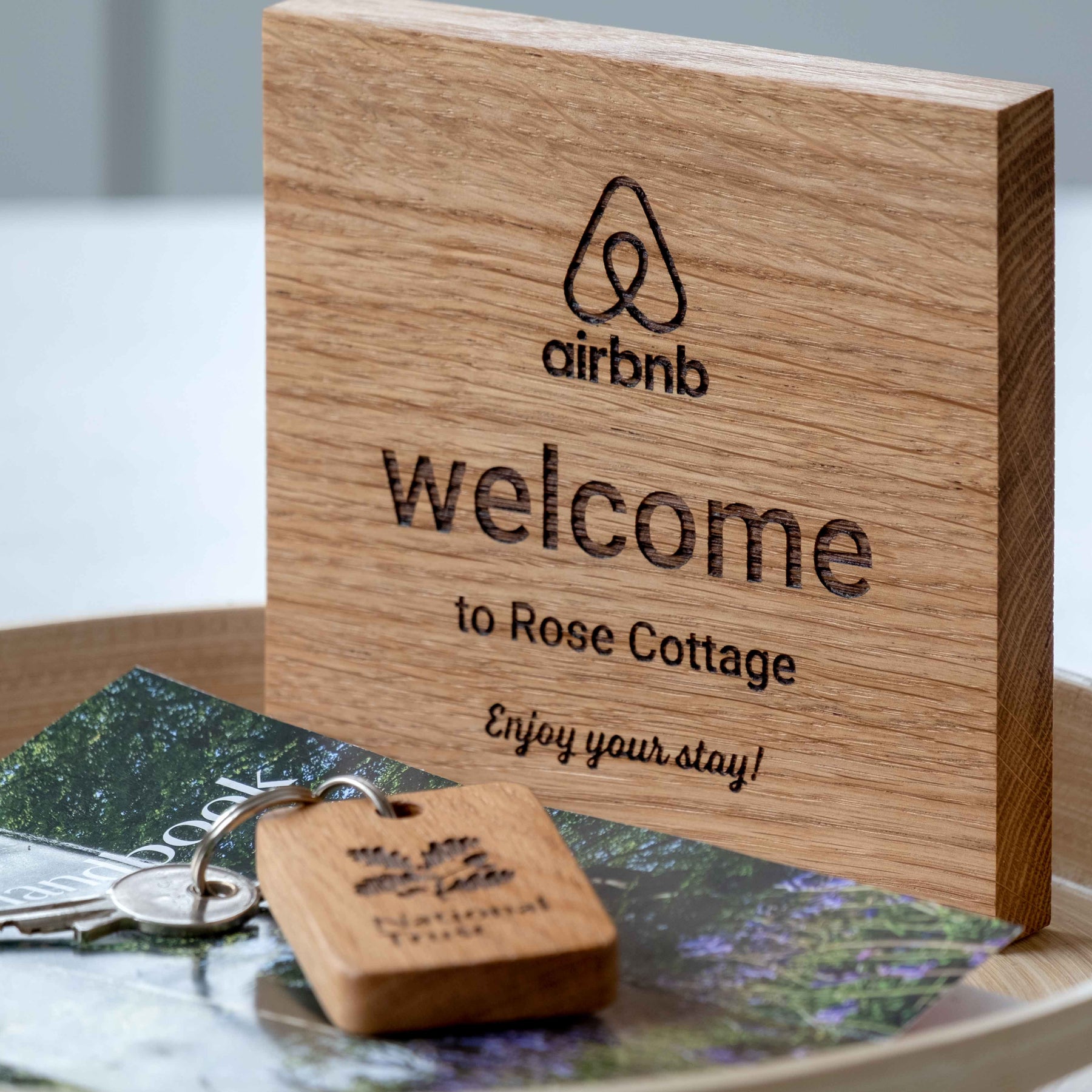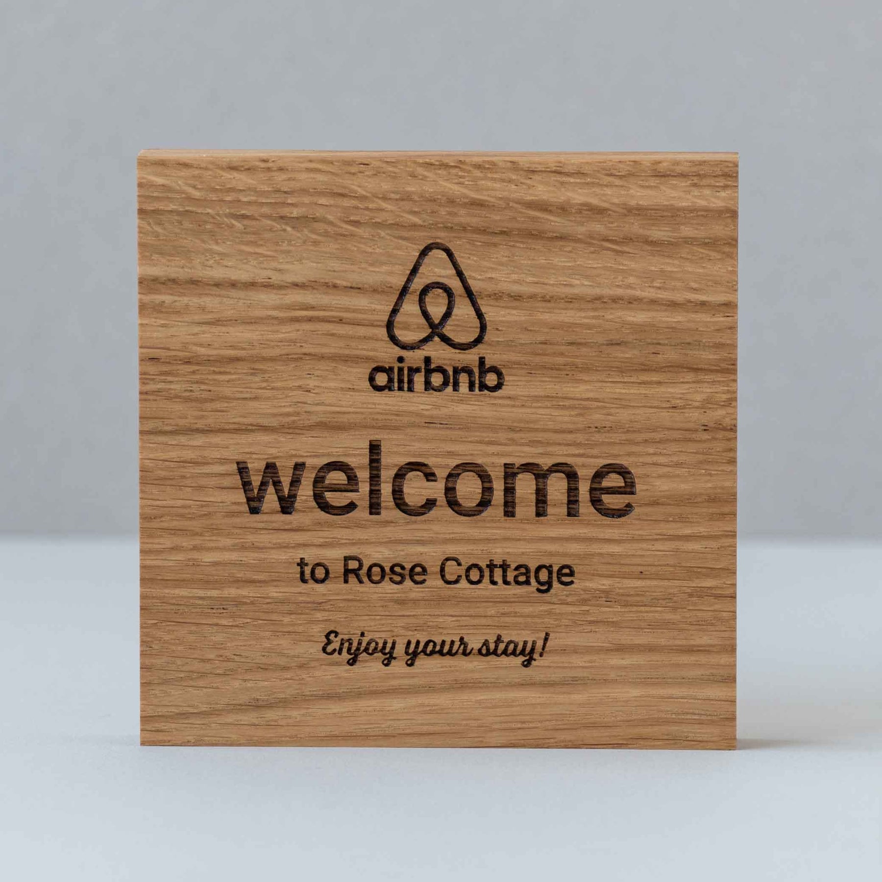 This engraved wood sign comes as standard, with the Airbnb logo, and text 'welcome' and 'enjoy your stay'. The sign can then be personalised with your property name. This sign is engraved on one side only.